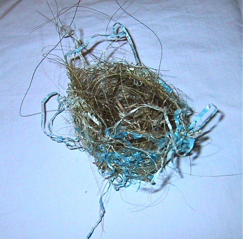 This spring, we found a bird’s nest in a tree made completely from horse farm materials: strips from a blue tarp, horse hair and a few tiny twigs and leaves (which you can’t see) at the bottom, to give it structure.